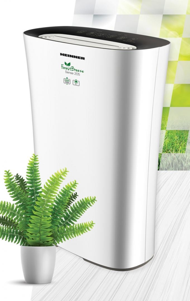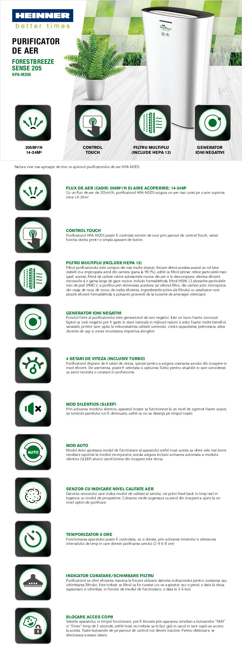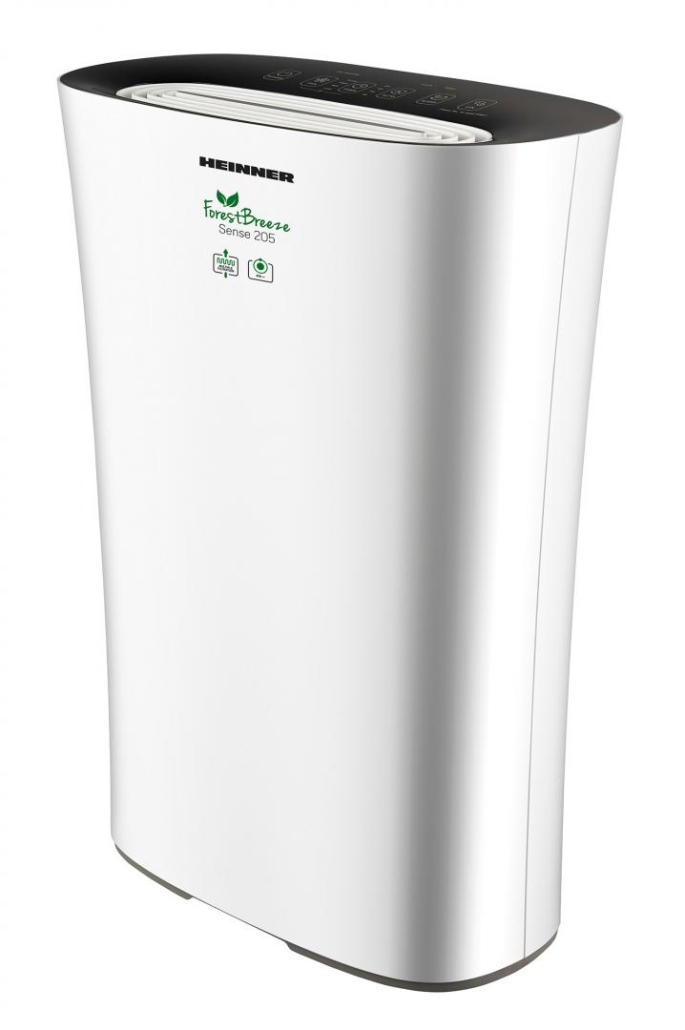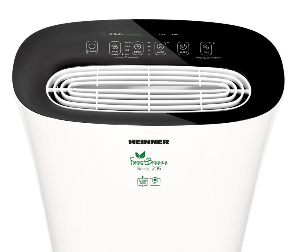 Purificator de aer Heinner HPA-M205, arie de acoperire 14-24m², CADR (flux de aer) 205m³/h, control tactil, filtru compus (include filtru HEPA 13), generator de ioni negativi, mod silențios, mod Auto , indicator pentru curățare filtru/schimbare filtru, 4 setări (inclusiv Turbo), temporizator 8 ore, blocare acces copii, senzor cu indicator luminos calitate aer, putere: 22W, alb, cu panou de comandă negru
