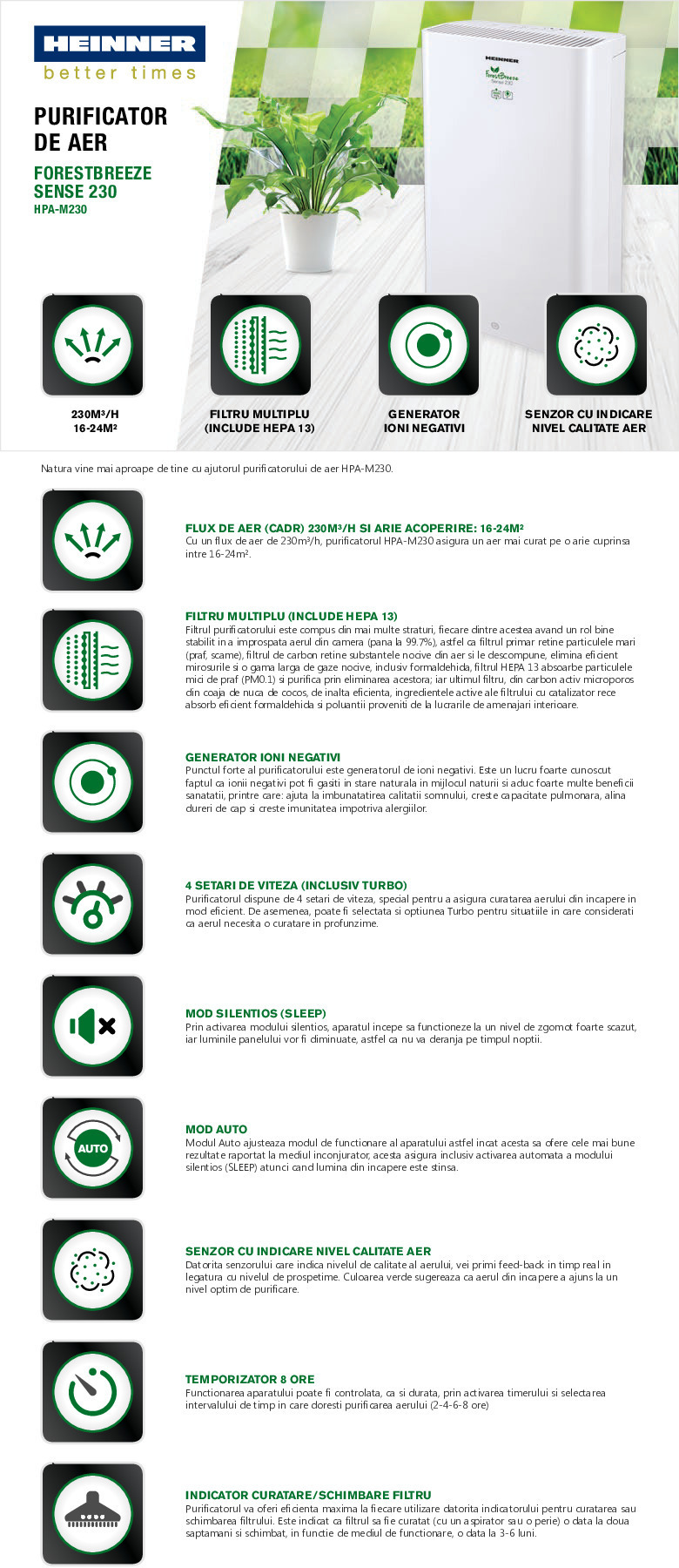 Purificator de aer Heinner HPA-M230, arie de acoperire 16-24m², CADR (Flux de aer) 230 m3/h, generator ioni negativi, temporizator 8 ore, mod silențios, mod Auto, indicator pentru curățare filtru, 4 setări manuale de viteză, filtru compus (include filtru HEPA 13), senzor cu indicator nivel calitate aer, putere: 50W , alb