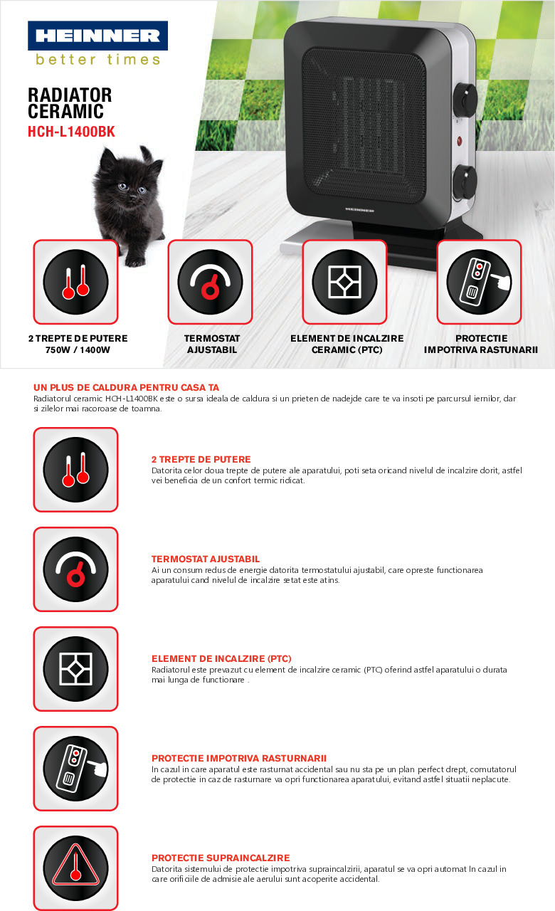 Radiator ceramic Heinner HCH-L1400BK, 2 trepte de putere: 750/1400W, indicator luminos „ON", termostat reglabil, element de încălzire ceramic (PTC) , protecție împotriva răsturnării, protecție la supraîncălzire