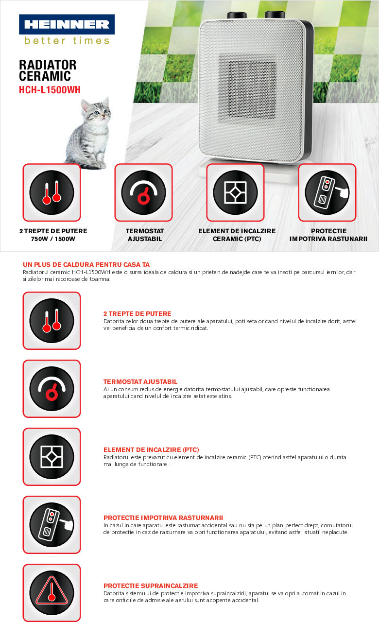 Radiator ceramic Heinner HCH-L1500WH, 2 trepte de putere: 750/1500W, indicator luminos „ON", termostat reglabil, element de încălzire ceramic (PTC), protecție împotriva răsturnării, protecție la supraîncălzire