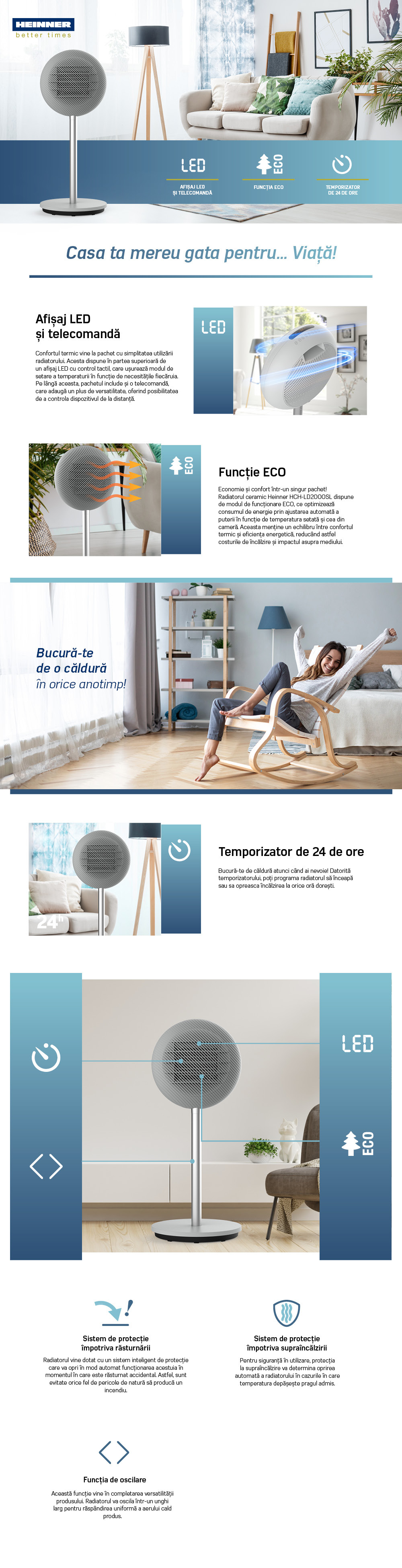 RADIATOR CERAMIC HEINNER HCH-LD2000SL, PUTERE: 1300/2000W, AFISAJ LED, CONTROL TACTIL, TELECOMANDA, FUNCTIE ECO, FUNCTIE OPRIRE AUTOMATA, TEMPORIZATOR: 24H, FUNCTIE OSCILARE, PROTECTIE IN CAZ DE RASTURNARE, PROTECTIE SUPRA-INCALZIRE, MANER PENTRU MANEVRARE USOARA, CULOARE: GRI