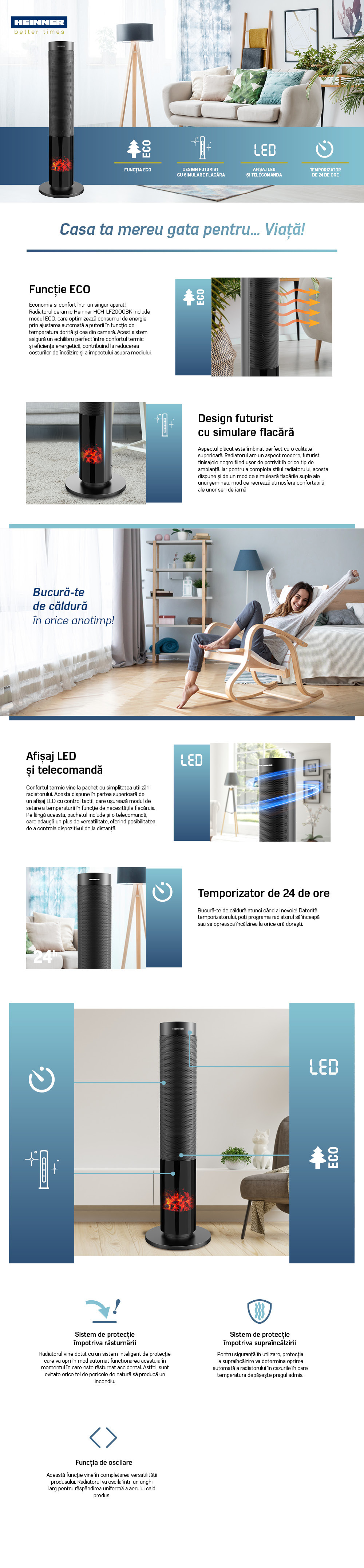 RADIATOR CERAMIC HEINNER HCH-LF2000BK, SIMULARE FLACARA, PUTERE: 1300/2000W, AFISAJ LED, CONTROL TACTIL, TELECOMANDA, FUNCTIE ECO, FUNCTIE OPRIRE AUTOMATA, TEMPORIZATOR: 24H, FUNCTIE OSCILARE, PROTECTIE IN CAZ DE RASTURNARE, PROTECTIE SUPRA-INCALZIRE, MANER PENTRU MANEVRARE USOARA, CULOARE: NEGRU