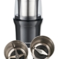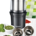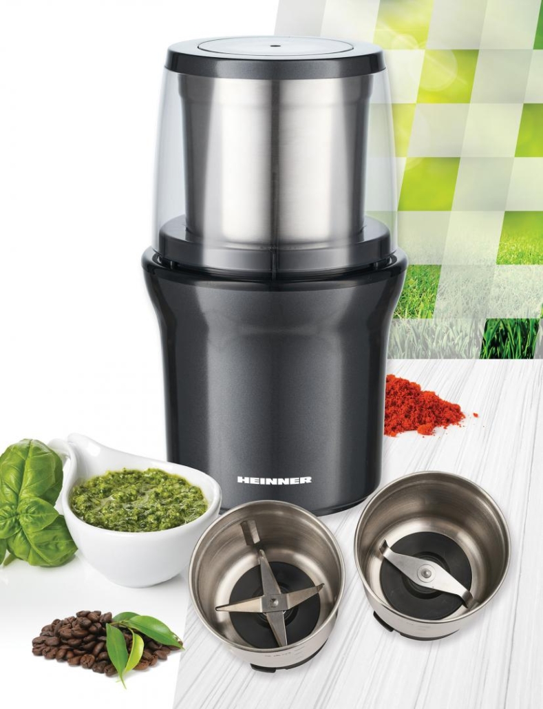 Rasnita electrica HEINNER HCG-200DG2, 2 recipiente din inox detasabile, rasnire uscata si umeda, lame din inox, capacitate 70g, operare prin apasare capacului, carcasa din inox, putere 200W, gri sidef inchis