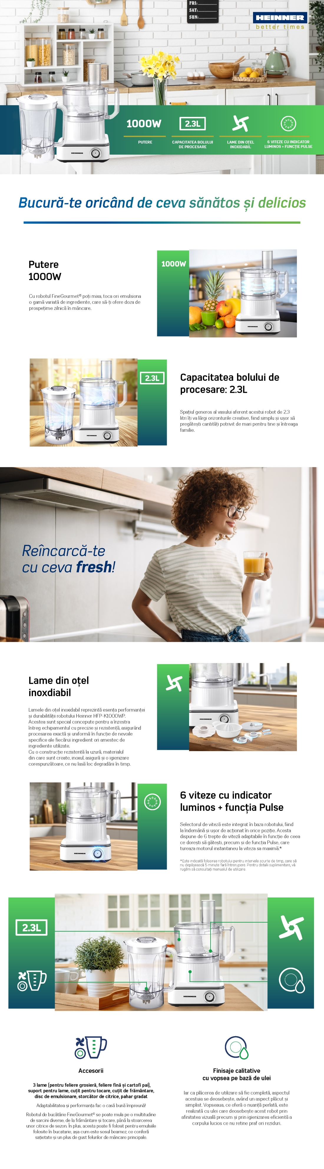 ROBOT DE BUCATARIE HEINNER FINEGOURMET HFP-K1000WP, 1000W, 6 VITEZE + PULSE, BOL PROCESARE: 2.3L, LAME INOX, ACCESORII: DISC FRAMANTARE, 3 LAME, DISC EMULSIFIERE, CANA PLASTIC 1.5L, STORCATOR CITRICE, CARCASA ALBA VOPSITA IN ULEI