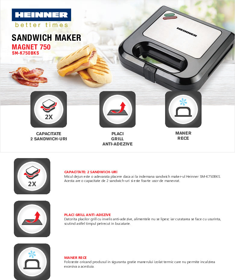 Sandwich maker Heinner SM-K750BKS, placi grill anti-adezive, putere: 750W, capacitate: 2 sandwich-uri, indicator luminos "gata de folosire", indicator luminos alimentare, dimensiuni placi:22.5 x 13 cm, negru cu insertii din inox
