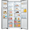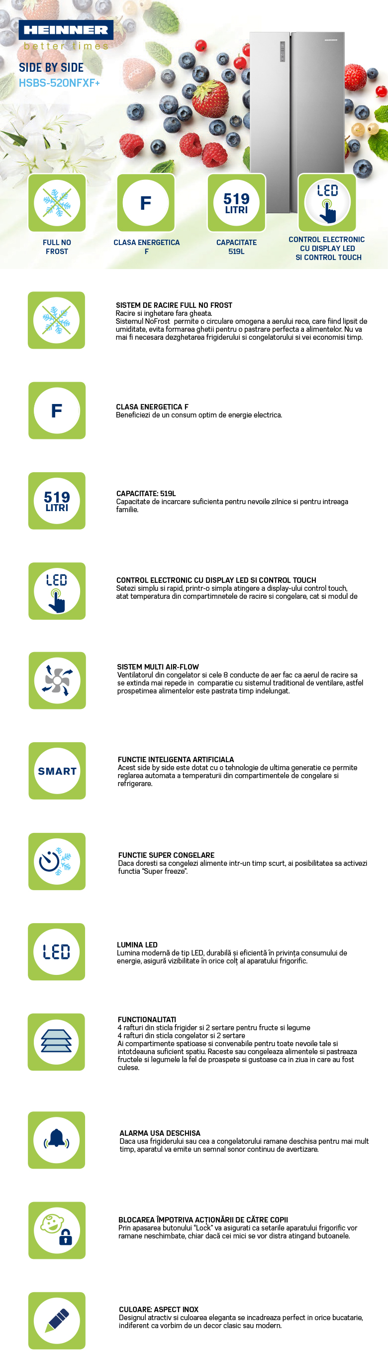 Side by side Heinner HSBS-520NFXF+, Full No Frost, sistem "Multi Air- Flow", clasa energetica: F, display LED cu control touch, capacitate totala: 519L, capacitate frigider: 334L, capacitate congelator: 185L, lumina LED, functie Super congelare, functie "Inteligenta artificiala", alarma usa deschisa, blocare acces copii, 4 rafturi din sticla frigider, 2 compartimente pentru fructe si legume, 4 rafturi congelator, 2 sertare congelator, suport oua, tavita cuburi de gheata, dimensiuni (WxDxH): 91 x 64.3 x 178.6 cm, culoare: Aspect INOX