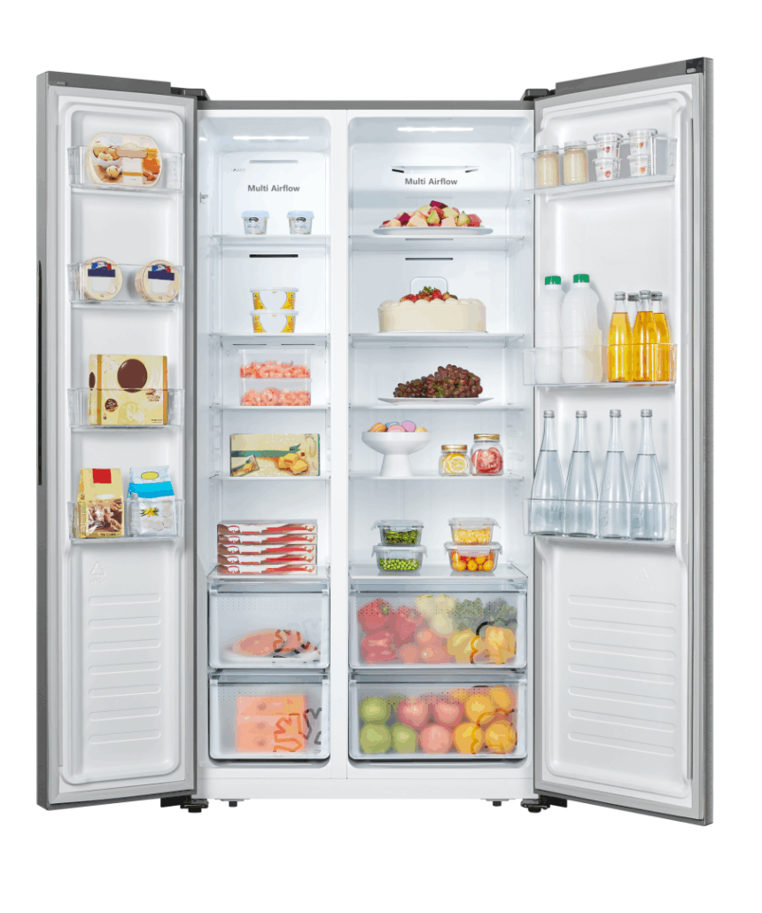 Side by side Heinner HSBS-520NFXF+, Full No Frost, sistem "Multi Air- Flow", clasa energetica: F, display LED cu control touch, capacitate totala: 519L, capacitate frigider: 334L, capacitate congelator: 185L, lumina LED, functie Super congelare, functie "Inteligenta artificiala", alarma usa deschisa, blocare acces copii, 4 rafturi din sticla frigider, 2 compartimente pentru fructe si legume, 4 rafturi congelator, 2 sertare congelator, suport oua, tavita cuburi de gheata, dimensiuni (WxDxH): 91 x 64.3 x 178.6 cm, culoare: Aspect INOX