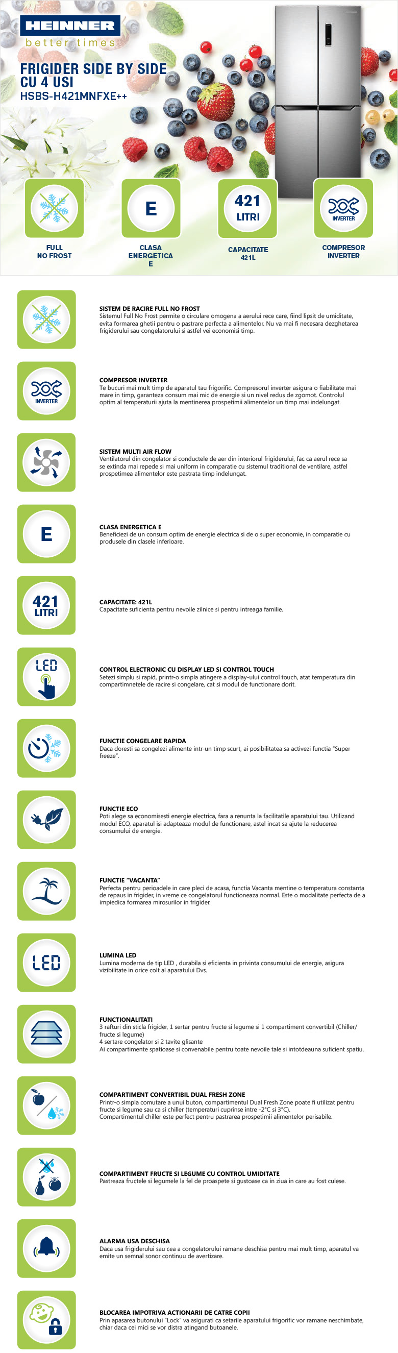 Side by side Heinner HSBS-H421MNFXE++, Full No Frost, Compresor inverter, Clasa energetica: E, Display LED cu control touch, Capacitate totala: 421L, Capacitate frigider: 271L, Capacitate congelator: 150L, Lumina LED, Functie ECO, Functie "Vacanta", Functie "Super congelare", Alarma usa deschisa, Blocare acces copii, 3 rafturi din sticla frigider, 1 compartiment pentru fructe si legume cu control umiditate, 1 compartiment convertibil Dual Fresh zone (chiller/fructe si legume), 4 sertare congelator, 2 tavite glisante congelator, Dimensiuni (WxDxH): 79 x 70 x 180 cm, Culoare: Aspect inox