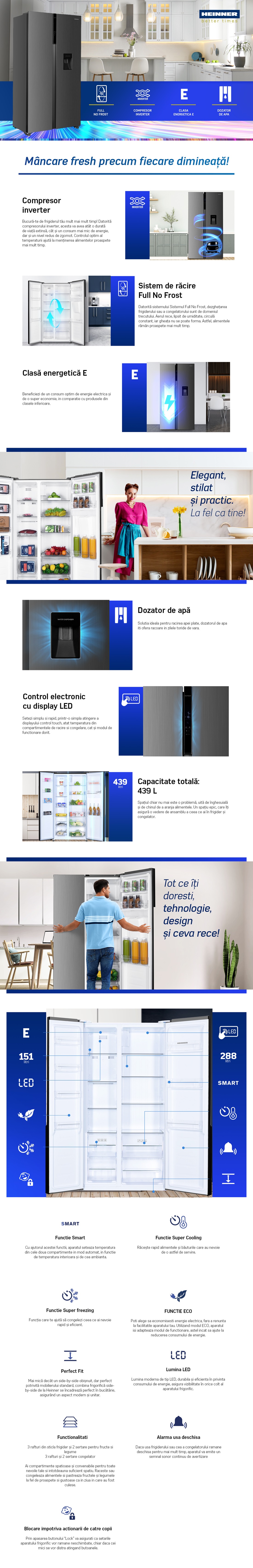 Side by side Heinner HSBS-H439NFXWDE++, Full No frost, Compresor inverter, Dozator de apa, Clasa energetica E, Display LED cu control touch, Capacitate totala: 439L, Capacitate frigider: 288L, Capacitate congelator: 151L, Lumina LED, Functie SMART, Functie ECO, Super cooling, Super freezing, Alarma usa deschisa, Blocare acces copii, 3 rafturi din sticla frigider, 2 compartimente pentru fructe si legume, 3 rafturi congelator, 2 sertare congelator, Dimensiuni produs : 90 x 59.5 x 177 cm, Culoare: Aspect inox