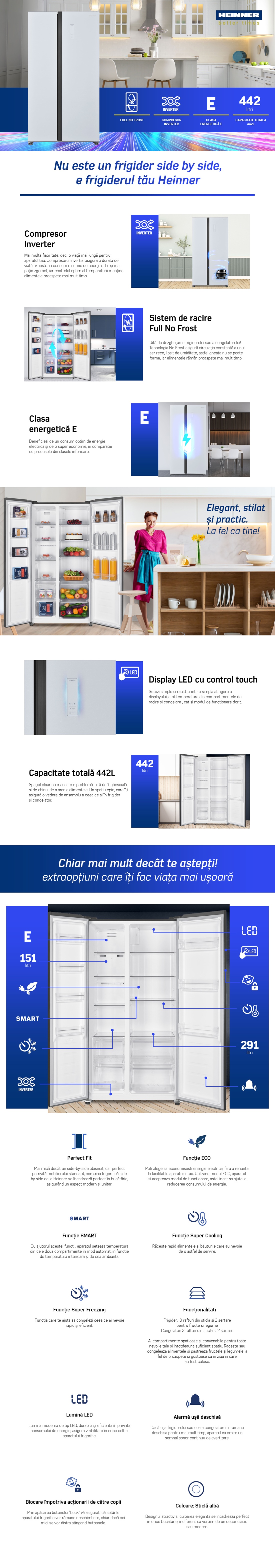 Side by side Heinner HSBS-H442NFGWHE++, Full No frost, Compresor inverter, Clasa energetica E, Display LED cu control touch, Capacitate totala: 442L, Capacitate frigider: 291L, Capacitate congelator: 151L, Lumina LED, Functie SMART, Functie ECO, Super Cooling, Super freezing, Alarma usa deschisa, Blocare acces copii, 3 rafturi din sticla frigider, 2 compartimente pentru fructe si legume, 3 rafturi congelator, 2 sertare congelator, Dimensiuni (WxDxH): 90 x 59 x 177 cm, Culoare: sticla alba