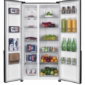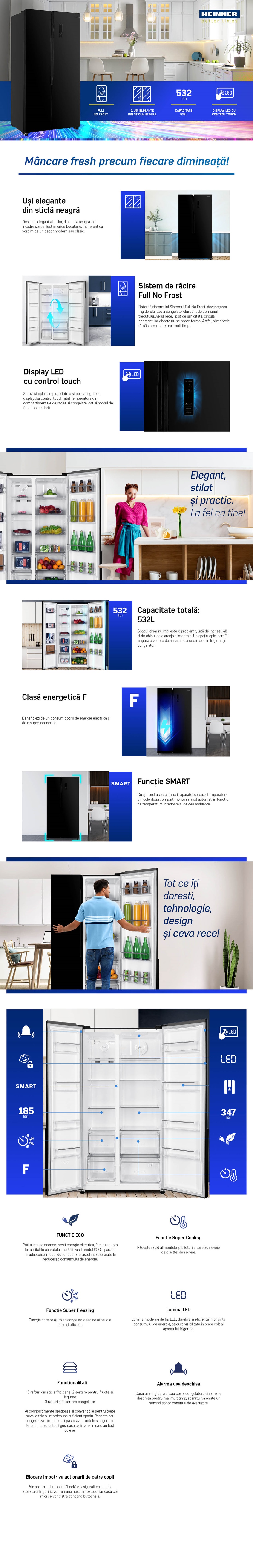 Side by side Heinner HSBS-H532NFGBKF+, Full No Frost, Clasa energetica F, Display touch, Control electronic, Capacitate totala: 532L, Capacitate frigider: 347L, Capacitate congelator: 185L, Functie SMART, Functie ECO, Super Cooling, Super freezing, Alarma usa deschisa, Blocare acces copii, 3 rafturi din sticla frigider, 2 compartimente pentru fructe si legume, 3 rafturi congelator, 2 sertare congelator, Dimensiuni (WxDxH): 90 x 66 x 177 cm, Culoare: Sticla neagra