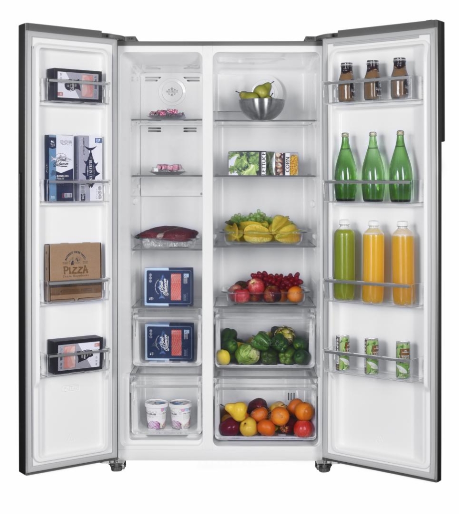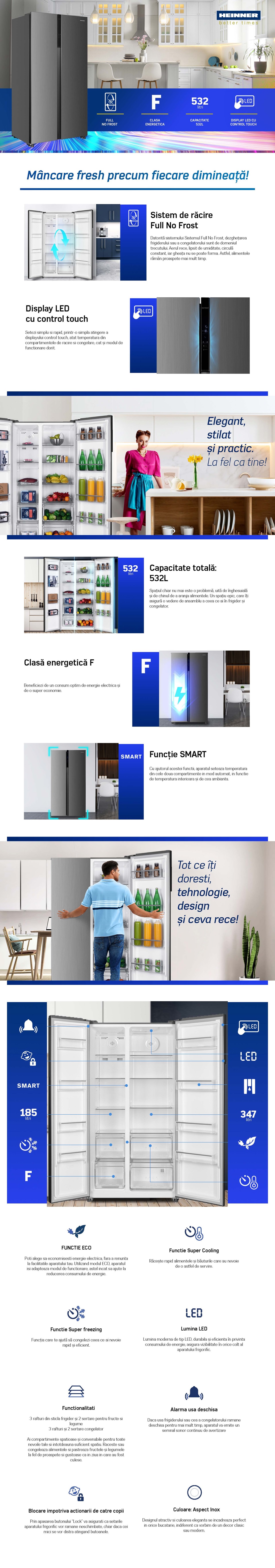 Side by side Heinner HSBS-H532NFXF+, Full No Frost, Clasa energetica F, Display touch, Control electronic, Capacitate totala: 532L, Capacitate frigider: 347L, Capacitate congelator: 185L, Functie SMART, Functie ECO, Super Cooling, Super freezing, Alarma usa deschisa, Blocare acces copii, 3 rafturi din sticla frigider, 2 compartimente pentru fructe si legume, 3 rafturi congelator, 2 sertare congelator, Dimensiuni (WxDxH): 90 x 66 x 177 cm, Culoare: Aspect inox