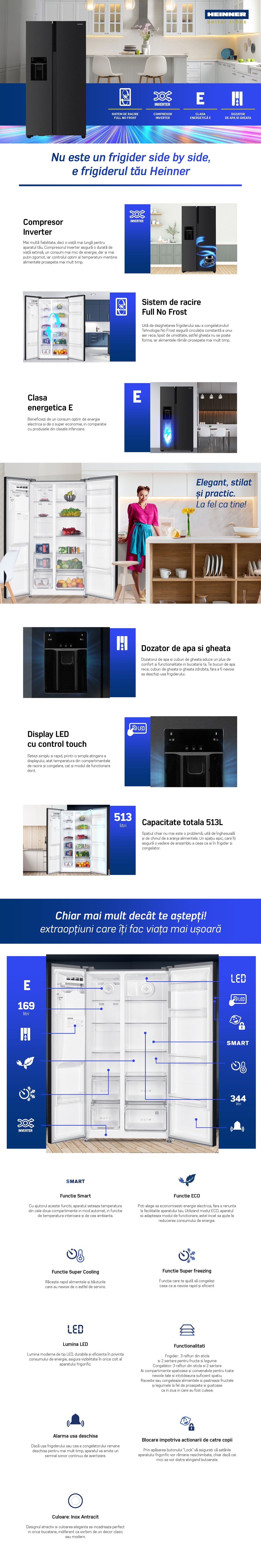 SIde by side Heinner HSBS-HM513NFIMDXE++, Full No frost, compresor Inverter, dozator de apa si gheata, clasa energetica: E, display LED cu control touch, capacitate totala: 513L, capacitate frigider: 344L, capacitate congelator: 169L, lumina LED, functie Smart, functie ECO, Super Cooling, Super Freezing, alarma usa deschisa, blocare acces copii, 3 rafturi din sticla frigider, 2 compartimente pentru fructe si legume, 3 rafturi congelator, 2 sertare congelator, Capacitate dozator de apa: 1.5L, Capacitate compartiment depozitare cuburi de gheata: 1.5Kg, alimentare dozator de la retea, dimensiuni (WxDxH): 90 x 66 x 177 cm cm, culoare: Inox antracit