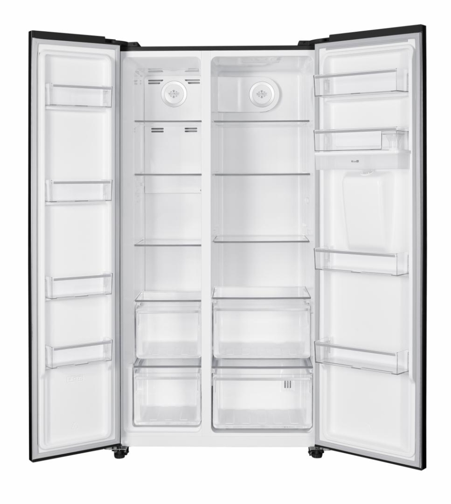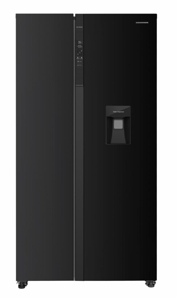 Side by side Heinner HSBS-HM529NFBKWDE++, Full No frost, compresor Inverter, dozator de apa, clasa energetica: E, display LED cu control touch, capacitate totala: 529L, capacitate frigider: 344L, capacitate congelator: 185L, lumina LED, functie Smart, functie ECO, Super Cooling, Super Freezing, alarma usa deschisa, blocare acces copii, 3 rafturi din sticla frigider, 2 compartimente pentru fructe si legume, 3 rafturi congelator, 2 sertare congelator, capacitate rezervor apa: 2.5L, dimensiuni (WxDxH): 90 x 66 x 177 cm, culoare: Negru
