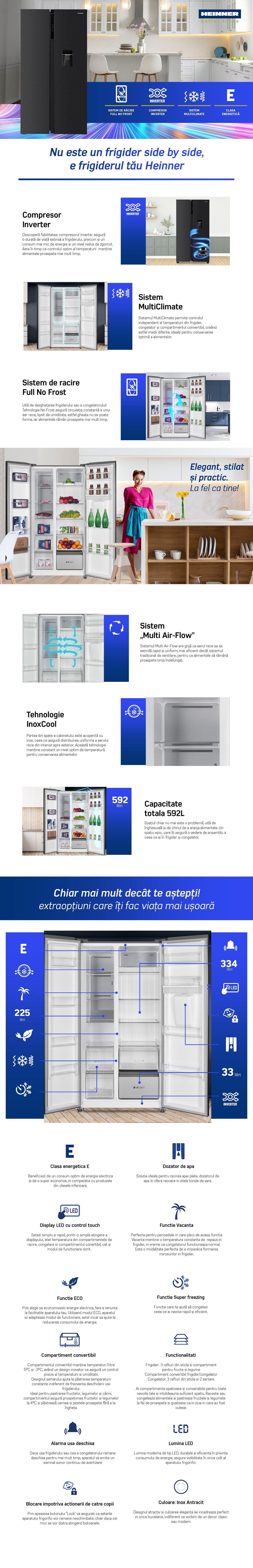 Side by side Heinner HSBS-HM592NFDXWDE++, Total No Frost, capacitate totala: 592L, capacitate frigider: 367L, capacitate congelator: 225L, clasa energetica E, compresor Inverter, display LED cu control touch, dozator de apa, sistem “Multi Air-Flow”, tehnologie InoxCool, sistem MultiClimate - 3 zone cu control independent al temperaturii (Frigider, congelator, zona convertibila), functie "Holiday", functie ECO, functie Super congelare, dotari frigider: 3 rafturi din sticla, compartiment pentru fructe si legume Compartiment convertibil frigider/congelator - temperaturi intre 5°C si -3°C, capacitate compartiment convertibil: 33L, dotari congelator: 3 rafturi din sticla, 2 sertare, capacitate dozator de apa: 3L, lumina LED, alarma usa deschisa, blocare acces copii, dimensiuni (LxAxI): 90 x 73 x 177 cm, culoare: Inox antracit