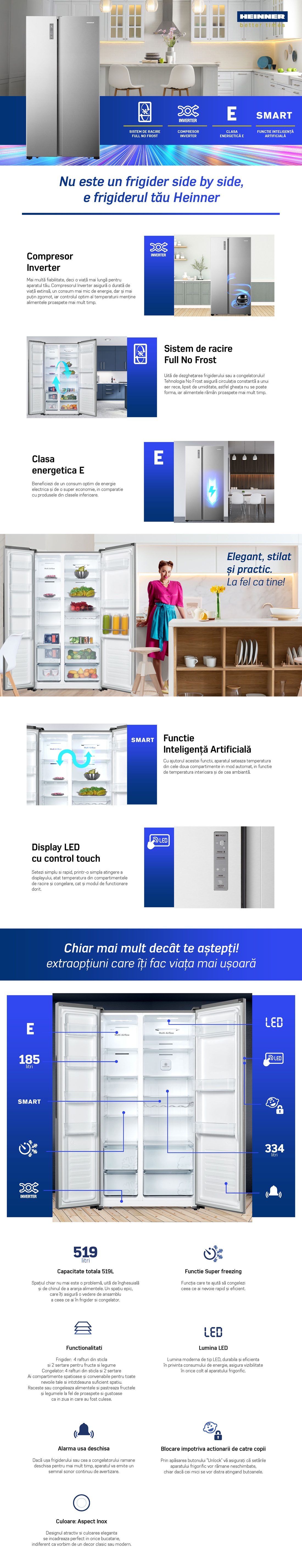 Side by side Heinner HSBS-HS519NFXE++, Full No Frost, sistem “Multi Air-Flow”, compresor Inverter, clasa energetica: E, display LED cu control touch, capacitate totala: 519L, capacitate frigider: 334L, capacitate congelator: 185L, lumina LED, functie Super congelare, functie “Inteligenta artificiala”, alarma usa deschisa, blocare acces copii, filtru antibacterian, 4 rafturi din sticla frigider, 2 compartimente pentru fructe si legume, raft pentru vinuri, 4 rafturi congelator, 2 sertare congelator, dimensiuni (WxDxH): 91 x 64.3 x 178.6 cm, culoare: Aspect inox
