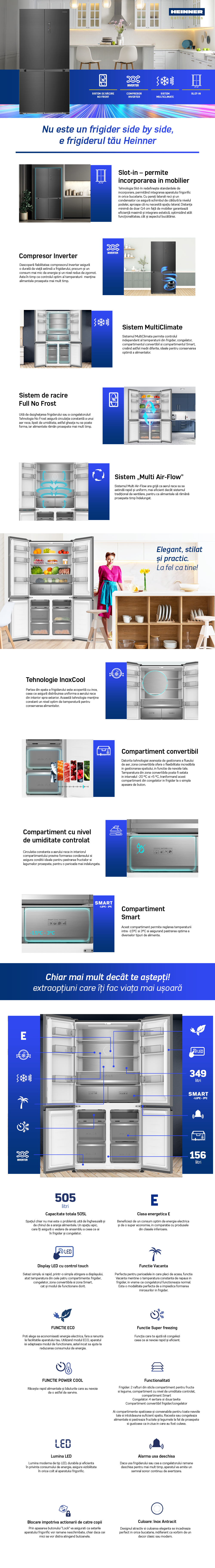 Side by side Multidoor Heinner HSBS-HM505MDSINFDXE++, Slot-in - permite incorporarea in mobila, Total No Frost, capacitate totala: 505L, capacitate frigider: 349L, capacitate congelator: 156L, clasa energetica: E, compresor Inverter, display LED cu control touch, sistem Multi Air-Flow, tehnologie InoxCool, sistem MultiClimate - 4 zone cu control independent al temperaturii (Frigider, congelator, zona convertibila, zona Smart), functie "Holiday", functie ECO, functie Super racire, functie Super congelare, dotari frigider: 2 rafturi din sticla, compartiment pentru fructe si legume, compartiment cu nivel de umiditate controlat, compartiment Smart - temperaturi intre -3 °C si +3 °C, dotari congelator: 4 sertare, 2 tavite pentru pizza, compartiment convertibil frigider/congelator - temperaturi intre -20 °C si +5 °C, capacitate compartiment convertibil: 80L, lumina LED, alarma usa deschisa, blocare acces copii, dimensiuni (WxDxH): 90.5 x 59.7 x 190.2 cm, culoare: Inox Antracit