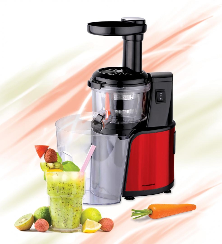 Storcator cu melc Heinner HSJ-600RD, putere 150W, Motor DC, rotatii: 80/min, functie reverse, protectie supraincalzire, sita din inox, diametru tub alimentare 45 mm, recipient pentru suc si pulpa, periuta pentru curatare , carcasa inox, culoare: rosu