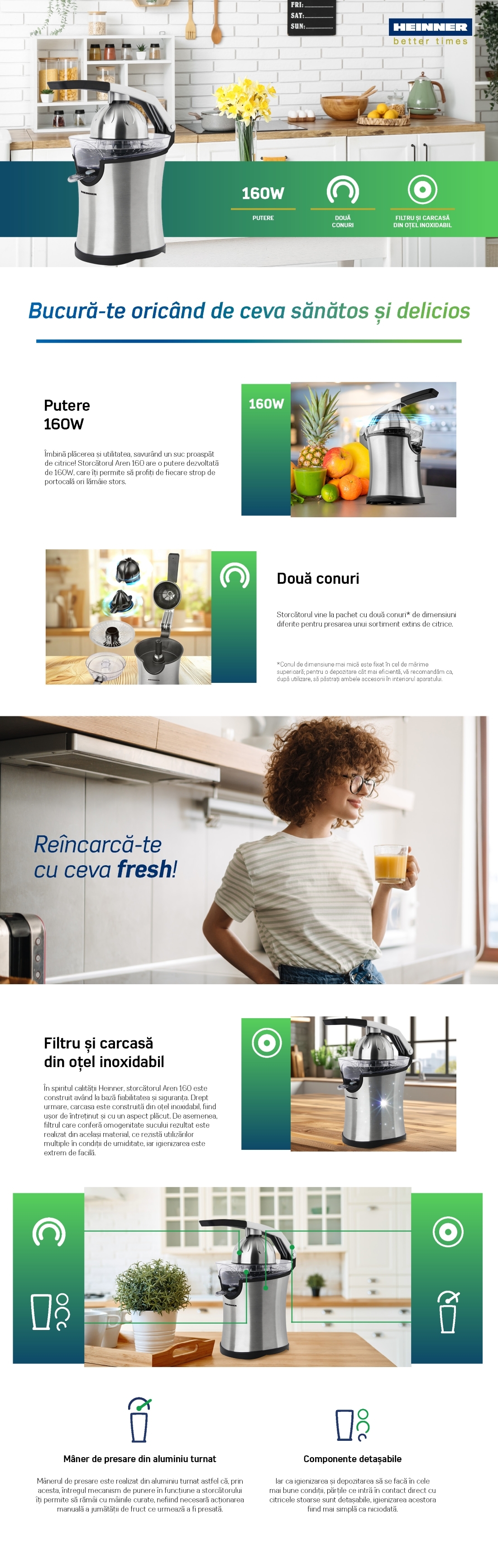 STORCATOR DE CITRICE HEINNER AREN HCP-160SS, 160W, 2 CONURI, FILTRU INOX, MANER CU ALUMINIU TURNAT, PICIORUSE ANTIALUNECARE, CARCASA INOX