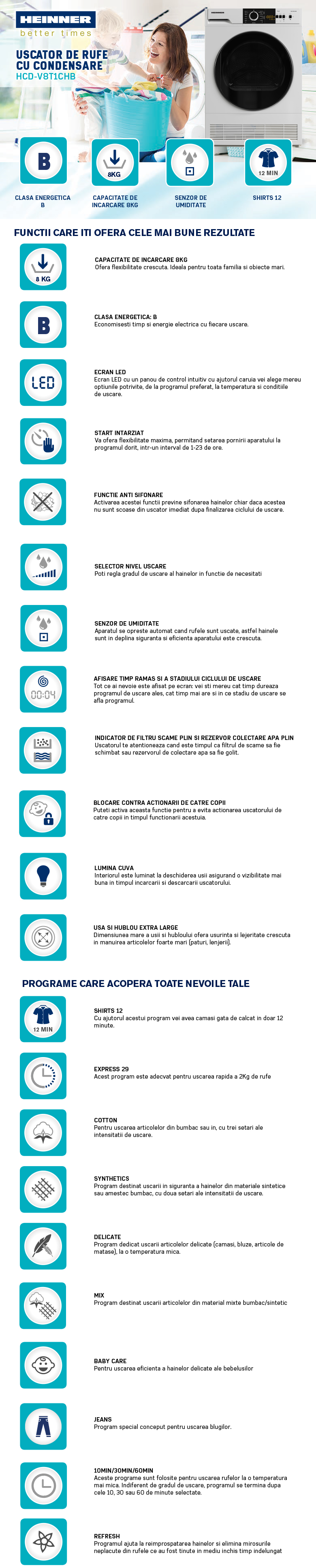 Uscator de rufe cu condensare Heinner HCD-V8T1CHB, Capacitate incarcare 8kg, Clasa energetica B, 15 programe de uscare, Display LED, Program rapid camasi 12 min, Program expres 29 min, Program Baby Care, Functie Start intarziat, Functie anti-sifonare, Lumina cuva, Selector nivel uscare, Indicator curatare filtru scame, Indicator rezervor colectare apa plin, Blocare acces copii, Dimensiuni ( LxAxI): 56.3x59.6x84.5 cm, Culoare: Alb