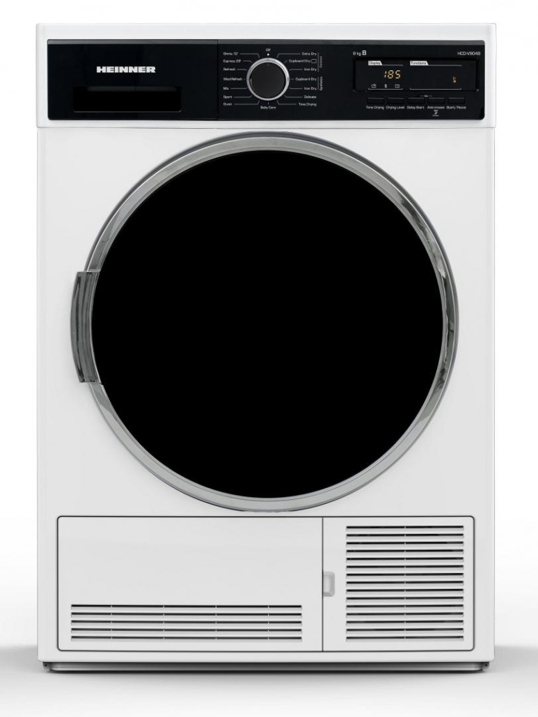 Uscator de rufe cu condensare Heinner HCD-V904B, Capacitate incarcare 9kg, Clasa energetica B, 15 programe de uscare, Design elegant cu panel negru si usa cromata, Display LED, Program rapid camasi 12 min, Program expres 29 min, Program Baby Care, Functie Start intarziat, Functie anti-sifonare, Lumina cuva, Selector nivel uscare, Indicator curatare filtru scame, Indicator rezervor colectare apa plin, Blocare acces copii, Dimensiuni ( LxAxI): 59.6x60.9x84.5 cm, Culoare: Alb