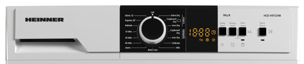Uscator de rufe cu condensare Heinner HCD-V9T1CHB, Capacitate incarcare 9kg, Clasa energetica B, 15 programe de uscare, Display LED, Program rapid camasi 12 min, Program expres 29 min, Program Baby Care, Functie Start intarziat, Functie anti-sifonare, Lumina cuva, Selector nivel uscare, Indicator curatare filtru scame, Indicator rezervor colectare apa plin, Blocare acces copii, Dimensiuni ( LxAxI): 60.9x59.6x84.5 cm, Culoare: Alb