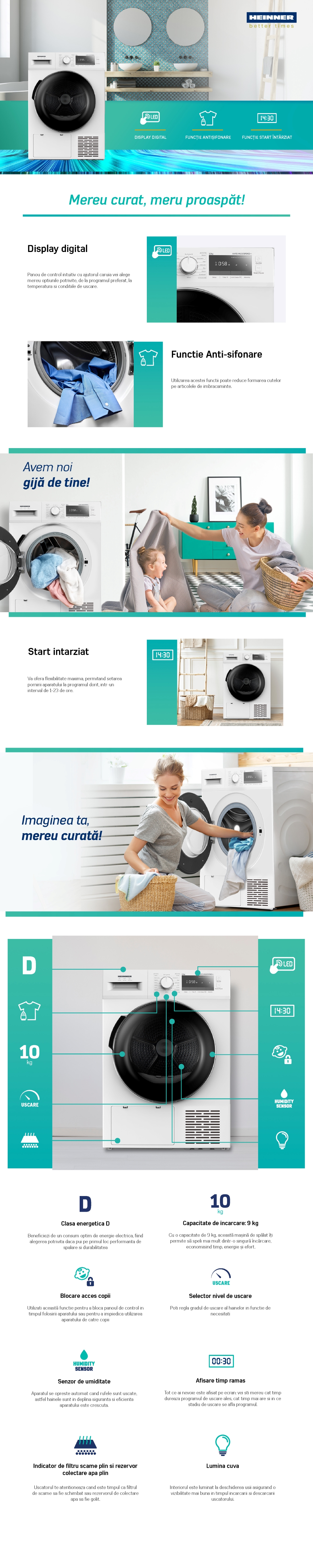 USCATOR DE RUFE CU POMPA DE CALDURA HEINNER HHPD-M10G5PBKD++, CAPACITATE INCARCARE 10KG, CLASA ENERGETICA D, 16 PROGRAME DE USCARE, DISPLAY LED, PROGRAM RAPID CAMASI, FUNCTIE START INTARZIAT, FUNCTIE ANTI-SIFONARE, LUMINA CUVA, SELECTOR NIVEL USCARE, INDICATOR CURATARE FILTRU SCAME, INDICATOR REZERVOR COLECTARE APA PLIN, HUBLOU USA PLASTIC, BLOCARE ACCES COPII, DIMENSIUNI ( LXAXI): CM, CULOARE: ALB