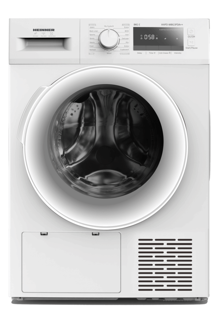 USCATOR DE RUFE CU POMPA DE CALDURA HEINNER HHPD-M8G3PDA++, CAPACITATE INCARCARE 8KG, CLASA ENERGETICA E, 16 PROGRAME DE USCARE, DISPLAY LED, PROGRAM RAPID CAMASI, FUNCTIE START INTARZIAT, FUNCTIE ANTI-SIFONARE, LUMINA CUVA, SELECTOR NIVEL USCARE, INDICATOR CURATARE FILTRU SCAME, INDICATOR REZERVOR COLECTARE APA PLIN, HUBLOU USA PLASTIC, BLOCARE ACCES COPII, DIMENSIUNI ( LXAXI): 59.5X60X84.5 CM, CULOARE: ALB