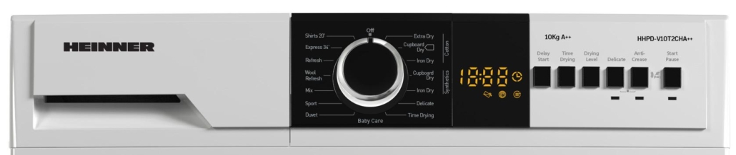 Uscator de rufe cu pompa de caldura Heinner HHPD-V10T2CHA++, Capacitate incarcare 10kg, Clasa energetica A+/E, 15 programe de uscare, Display LED, Program rapid camasi 20 min, Program expres 34 min, Program Baby Care, Functie Start intarziat, Functie anti-sifonare, Lumina cuva, Selector nivel uscare, Indicator curatare filtru scame, Indicator rezervor colectare apa plin, Blocare acces copii, Dimensiuni ( LxAxI): 63.9x59.6x84.5 cm, Culoare: Alb