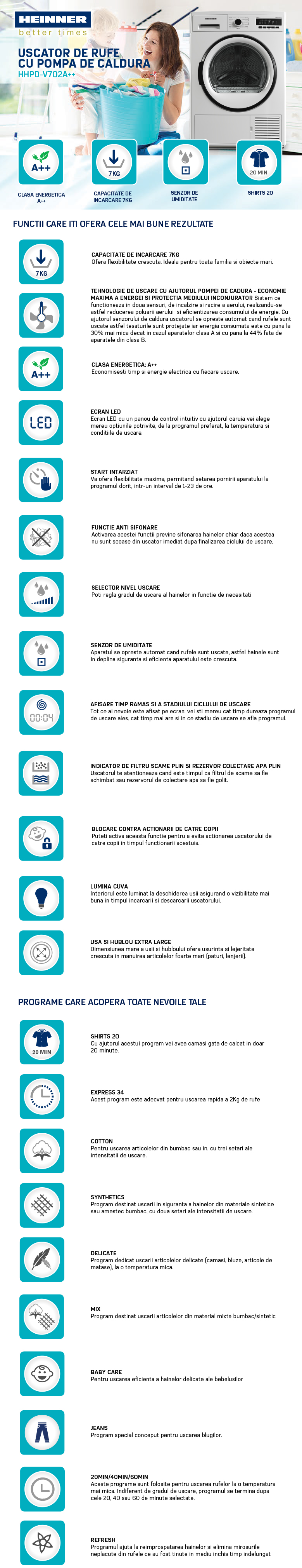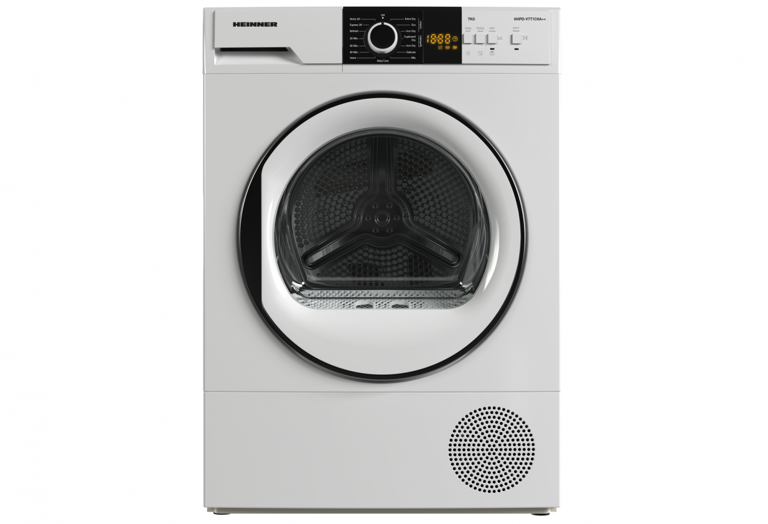 Uscator de rufe cu pompa de caldura Heinner HHPD-V702A++, Capacitate incarcare 7kg, Clasa energetica A++, 15 programe de uscare, Display LED, Program rapid camasi 20 min, Program expres 34 min, Program Baby Care, Functie Start intarziat, Functie anti-sifonare, Lumina cuva, Selector nivel uscare, Indicator curatare filtru scame, Indicator rezervor colectare apa plin, Blocare acces copii, Dimensiuni ( LxAxI): 52.5x59.6x84.5 cm, Culoare: Alb