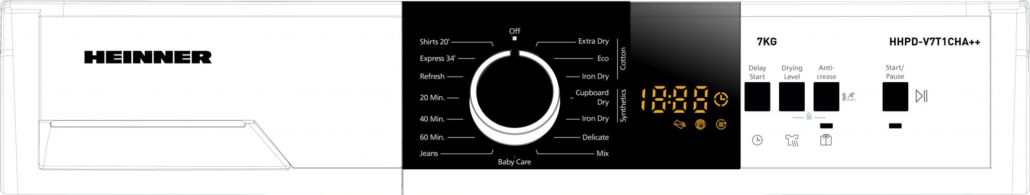 Uscator de rufe cu pompa de caldura Heinner HHPD-V7T1CHA++, Capacitate incarcare 7kg, Clasa energetica E, 15 programe de uscare, Display LED, Program rapid camasi 20 min, Program expres 34 min, Program Baby Care, Functie Start intarziat, Functie anti-sifonare, Lumina cuva, Selector nivel uscare, Indicator curatare filtru scame, Indicator rezervor colectare apa plin, Blocare acces copii, Dimensiuni ( LxAxI): 52.5x59.6x84.5 cm, Culoare: Alb