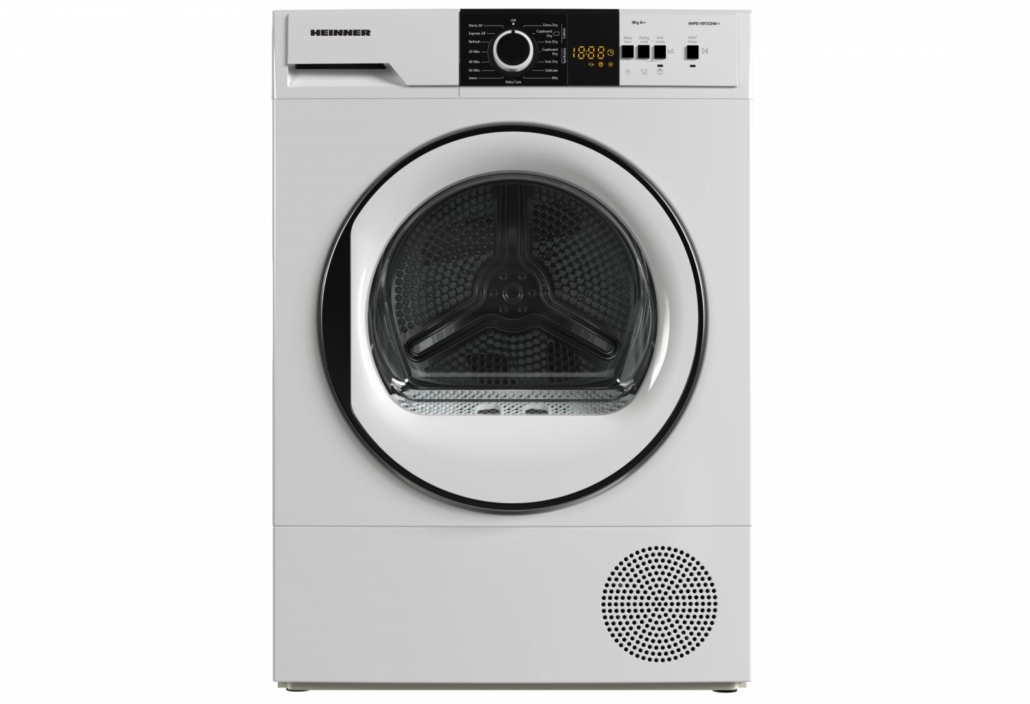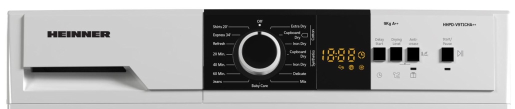 Uscator de rufe cu pompa de caldura Heinner HHPD-V9T1CHA++, Capacitate incarcare 9kg, Clasa energetica A+/E, 15 programe de uscare, Display LED, Program rapid camasi 20 min, Program expres 34 min, Program Baby Care, Functie Start intarziat, Functie anti-sifonare, Lumina cuva, Selector nivel uscare, Indicator curatare filtru scame, Indicator rezervor colectare apa plin, Blocare acces copii, Dimensiuni ( LxAxI): 60.9x59.6x84.5 cm, Culoare: Alb