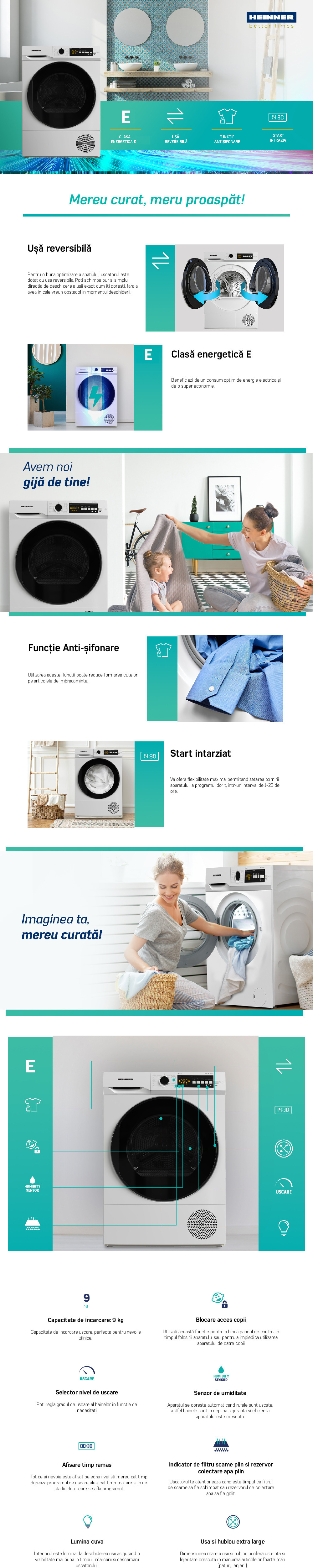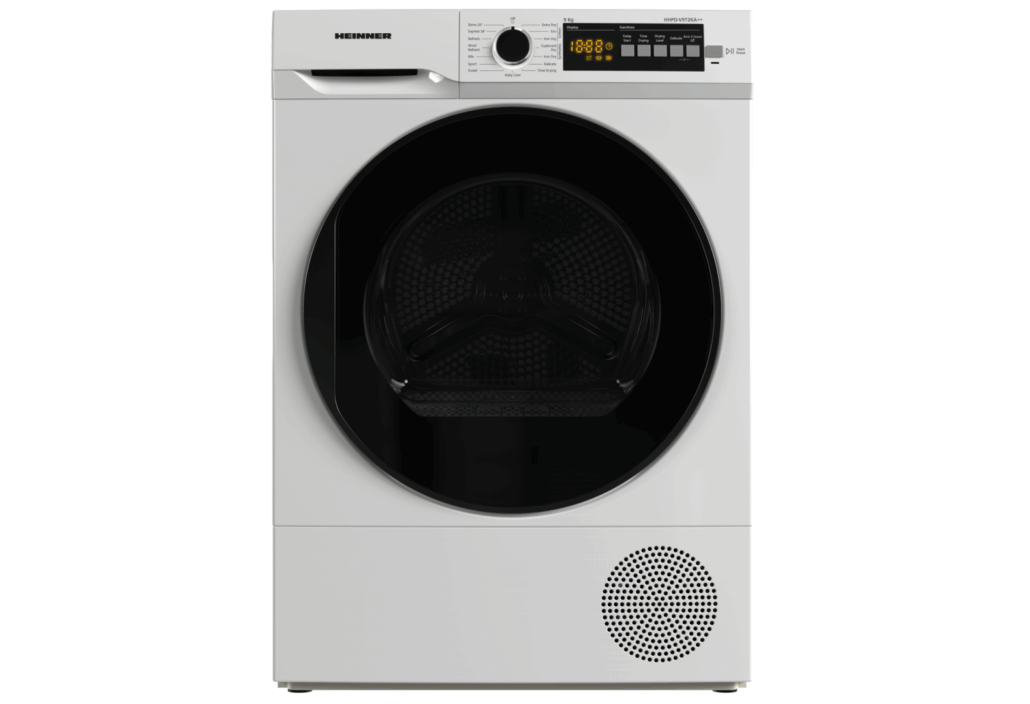 Uscator de rufe cu pompa de caldura Heinner HHPD-V9T2KA++, Capacitate incarcare 9kg, Clasa energetica E, 15 programe de uscare, Display LED, Program rapid camasi 20 min, Program expres 34 min, Program Baby Care, Functie Start intarziat, Functie anti-sifonare, Usa Reversibila, Lumina cuva, Selector nivel uscare, Indicator curatare filtru scame, Indicator rezervor colectare apa plin, Blocare acces copii, Dimensiuni ( LxAxI): 60.9x59.6x84.5 cm, Culoare: Alb