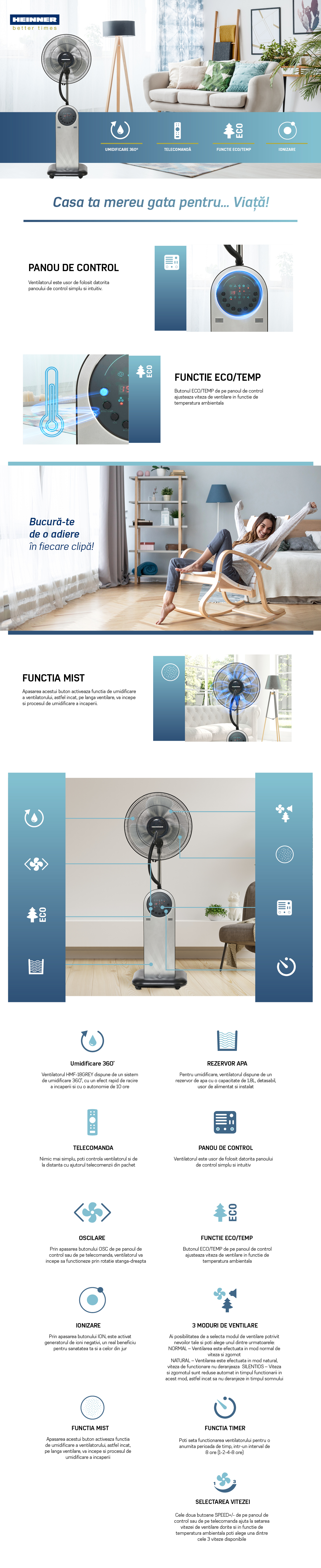 Ventilator cu pulverizare, 3 viteze: normal, natural, silentios, pulverizare 360˚, rezerv