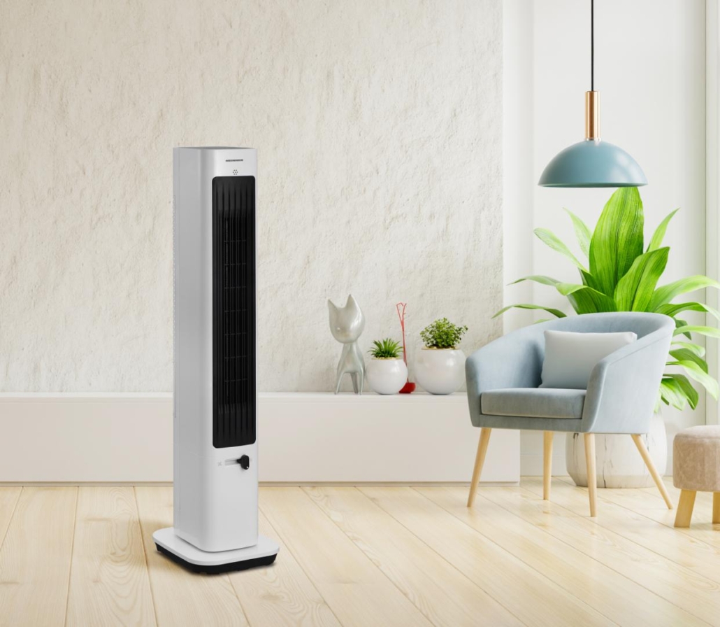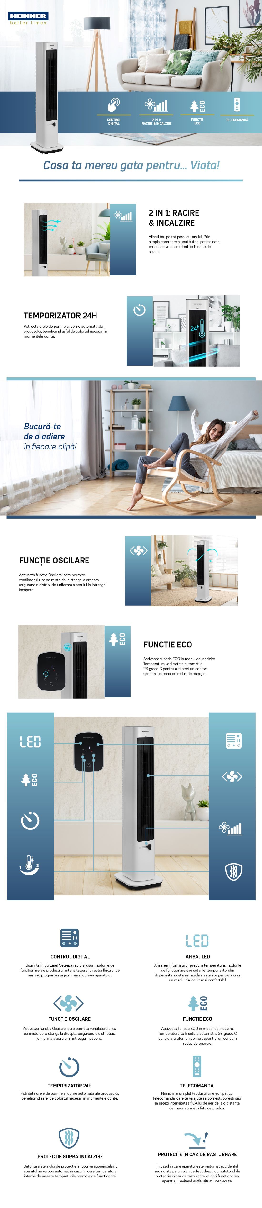 VENTILATOR TURN DIGITAL HEINNER HTFA-M20WH, 2 IN 1: RACIRE/INCALZIRE, CONTROL TOUCH, DISPLAY LED, 3 VITEZE RACIRE, 2 VITEZE INCALZIRE, FUNCTIE ECO, FUNCTIE OSCILARE 85 GRADE, TERMOSTAT DIGITAL, TIMER 24H, TELECOMANDA, PUTERE: 2000W, VOLUM RACIRE: 16.7m³/min, VITEZA RACIRE: 6.7m/s, VITEZA INCALZIRE: 1.72m/s, INALTIME 96 CM, ALB