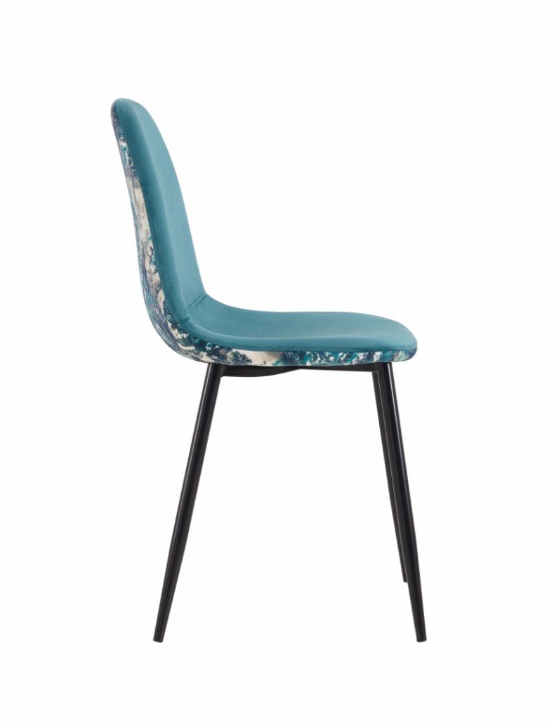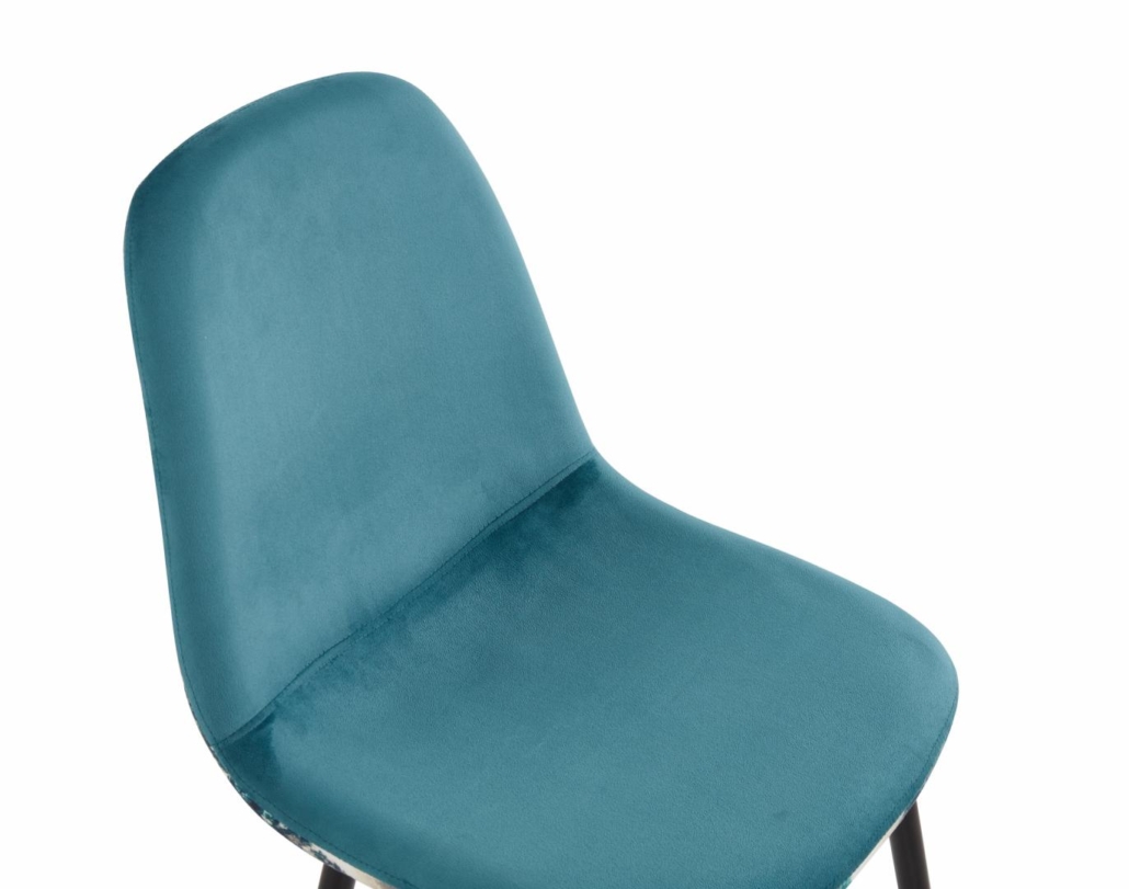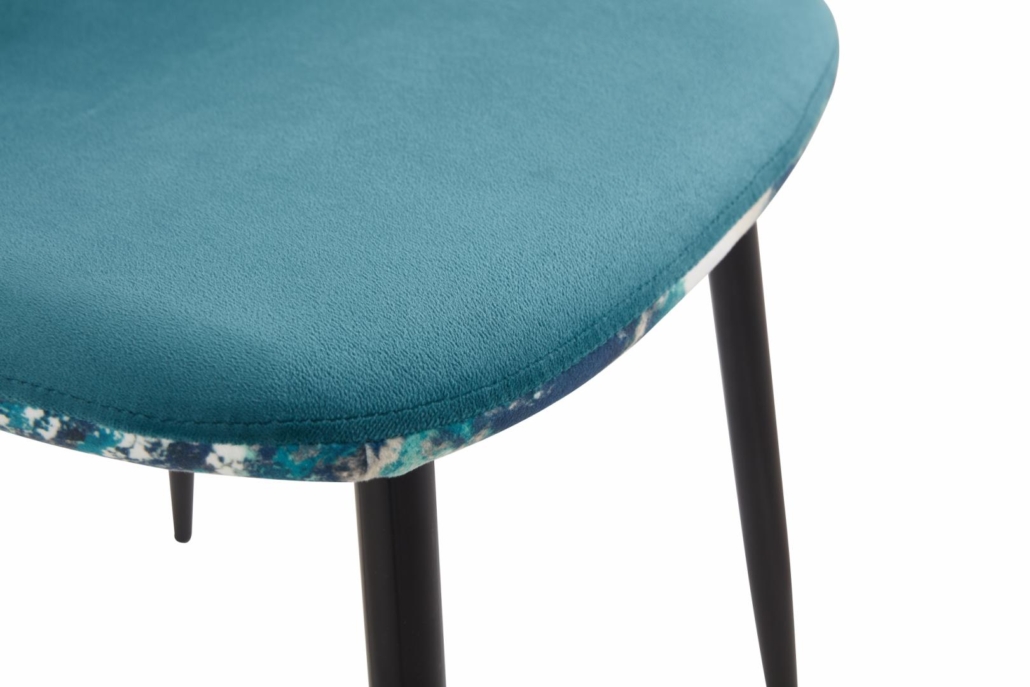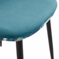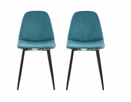 Set of 2 Jaquard Blue velvet dining chairs Seat dimensions: 48x46x87 cm Seat depth: 38 cm/Seat height 47 cm Material: black metal legs, plastic seat covered in velvet upholstery with Jaquard back, foam filling Maximum weight supported 120kg