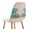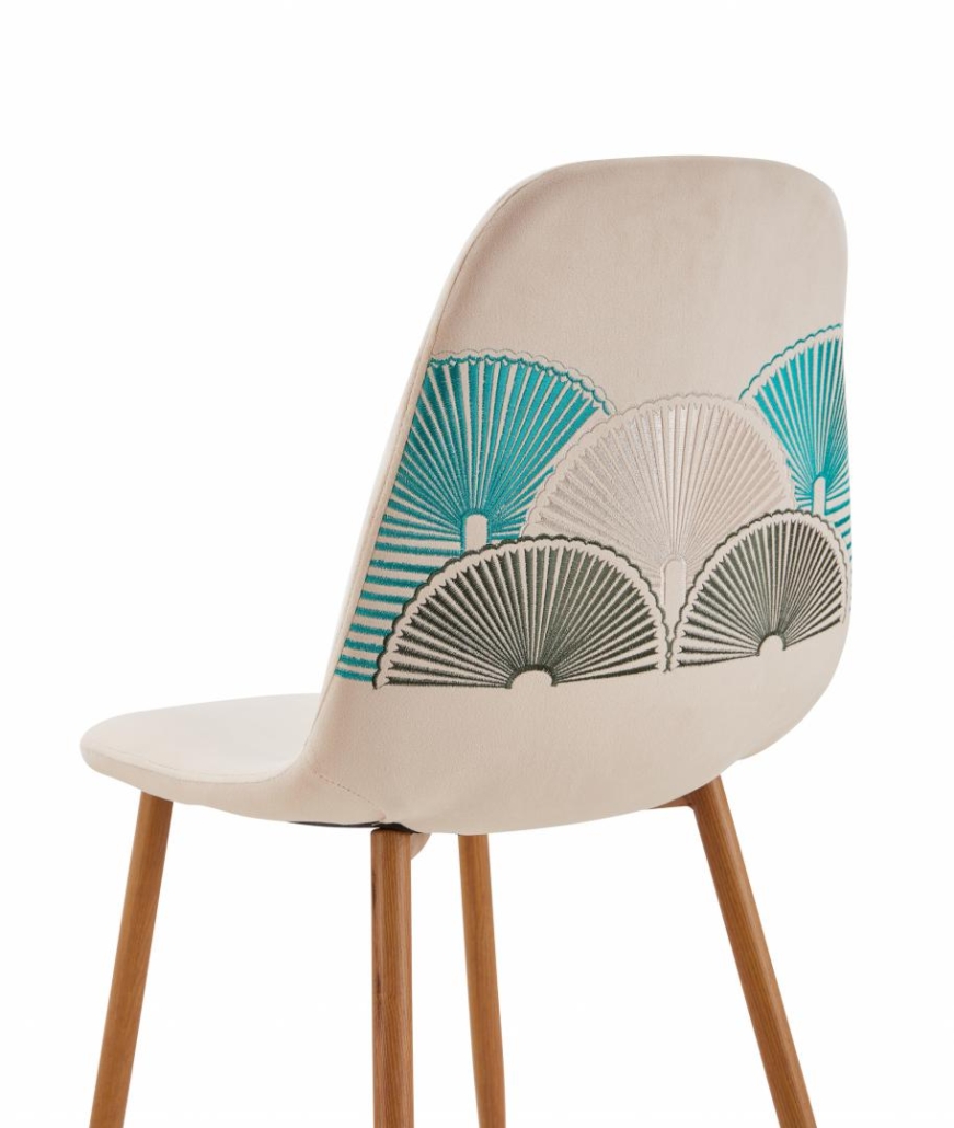 Material : picioare din metal cu aspect de lemn, sezut din plastic imbracat in tapiterie cu model brodat pe spate. Umplutura din spuma