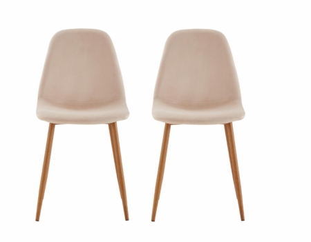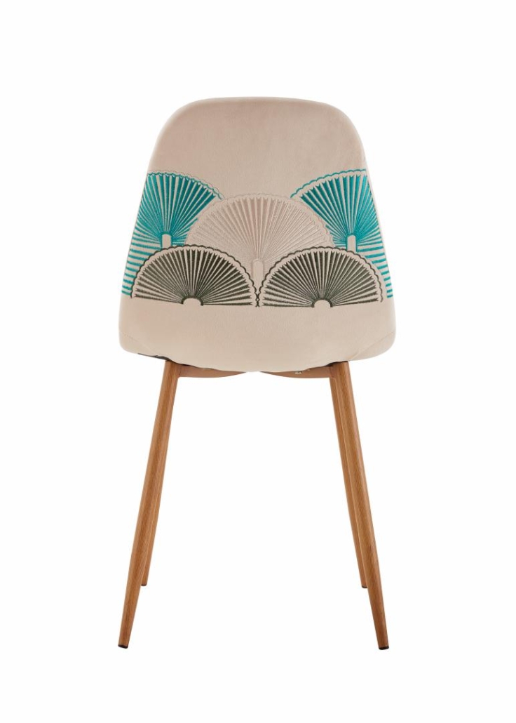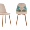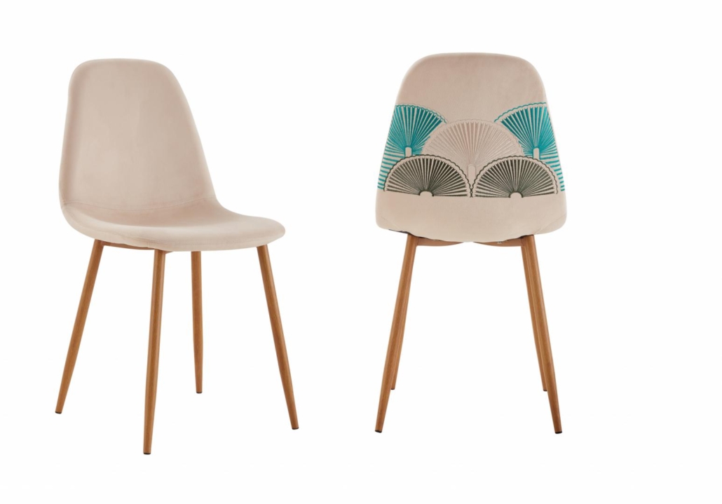 Set 2 scaune dining cu model brodat Bej Dimensiuni scaun : 48x46x87 cm Adancime sezut: 38 cm/Inaltime sezut 47 cm Material : picioare din metal cu aspect de lemn, sezut din plastic imbracat in tapiterie cu model brodat pe spate. Umplutura din spuma Greutate maxima suportata 120kg