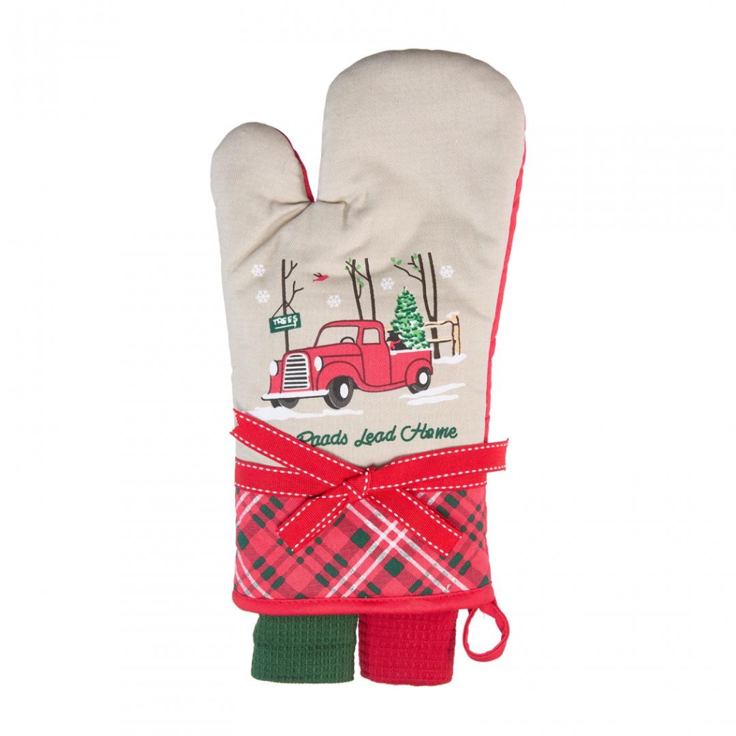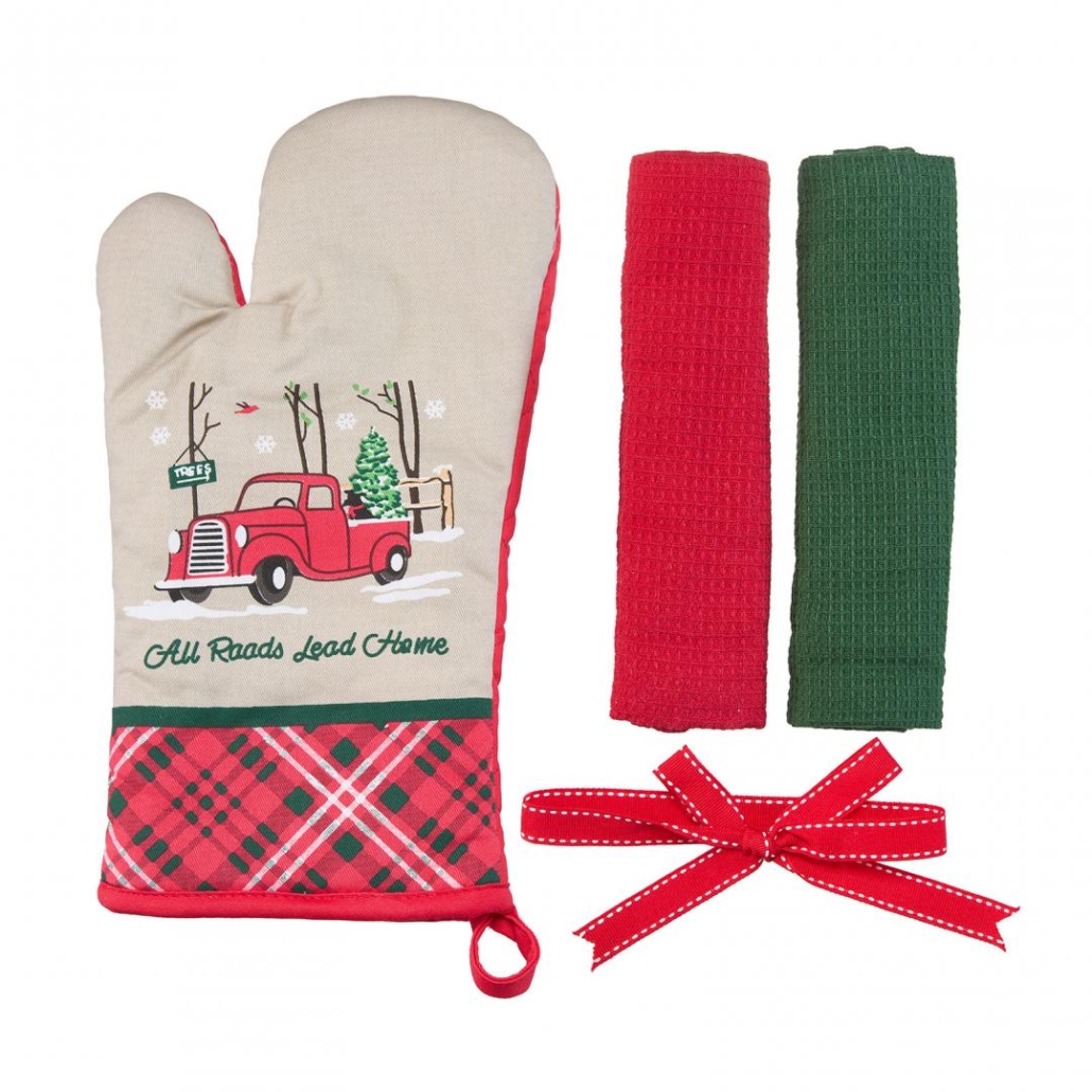 Setul contine: o manusa de bucatarie 18x28 cm (100% poliester), 2 prosoape de bucatarie dimensiune 38x64 cm, 100% Bumbac , 60gr/buc .