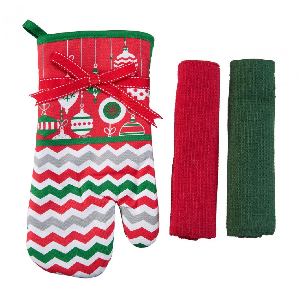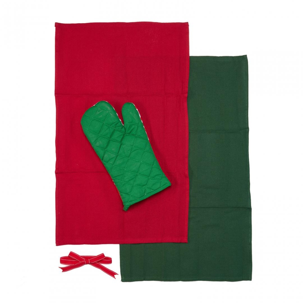 Setul contine: o manusa de bucatarie 18x28 cm (100% poliester), 2 prosoape de bucatarie dimensiune 38x64 cm, 100% Bumbac , 60gr/buc .